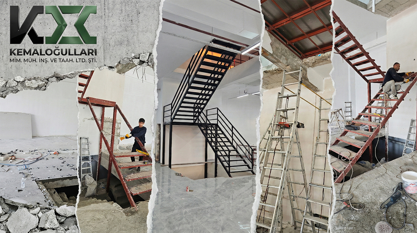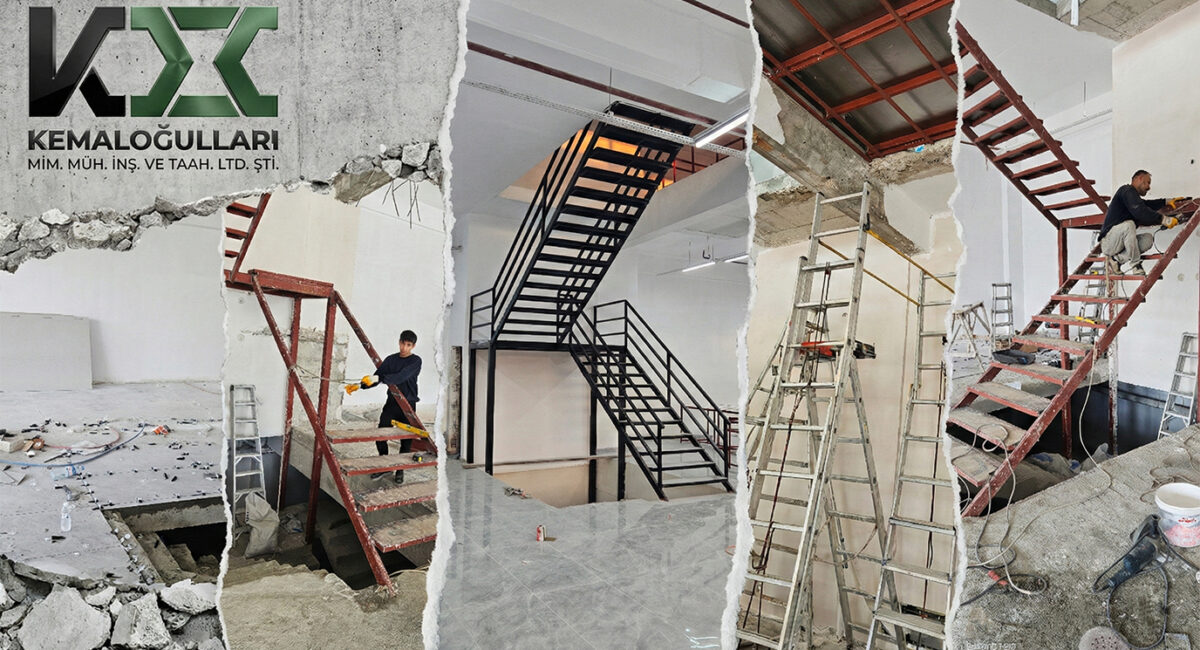 Çelik Merdiven İmalatı: Mağazanın katlar arası sirkülasyonunu sağlayan, hem estetik hem de statik açıdan yüksek mukavemete sahip çelik konstrüksiyon merdiven imal edilmiş ve montajı yapılmıştır.